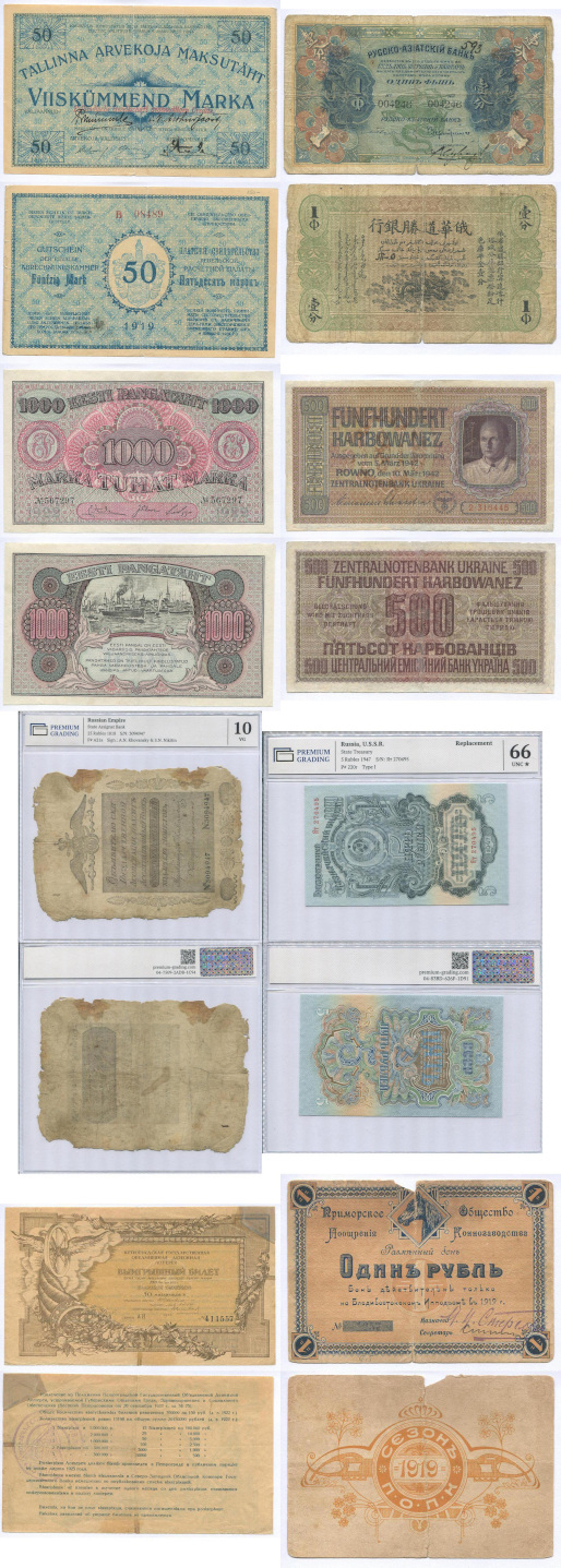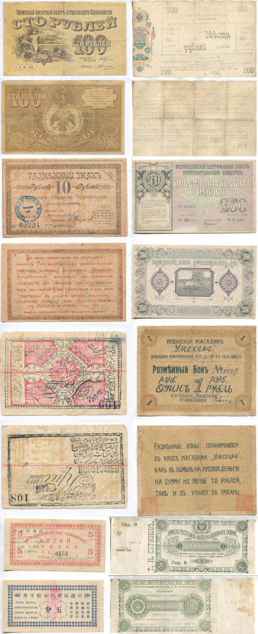 денежные знаки государственных и частных выпусков разных стран.