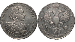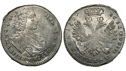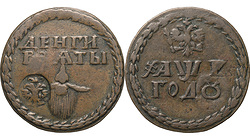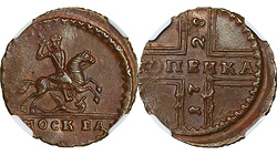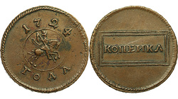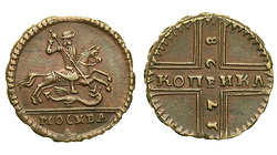 Кадашевский монетный двор. Описание из Корпуса ГМ: «Лиц. ст. Св. Георгий Победоносец на коне, обращённом вправо, поражающий копьём дракона, на земле покрытой травою. Под изображением отделённая двумя чертами надпись: КОПЕИКА. Вокруг всего узорчатый ободок. Об. ст. Вензель Императора Петра II из двух латинских «Р» и одного «А», переплетённых вместе. Над ним императорская корона. Под вензелем римская цифра II с точкою над каждою единицею. Всё в узорчатом ободке». Гурт узорный. Медь, 4,19 г. Биткин #231 (R4). Уздеников #3983 (!!). ГМ #12.10 (очень редкая) – в Корпусе приведено изображение экземпляра из собрания графа И.И. Толстого (отсутствовала в собрании Великого князя Георгия Михайловича). Сохранность превосходная, красивая патина. Экземпляр кабинетного хранения.