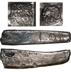 Серебряный платежный слиток – полтина (половинка слитка-гривны новгородского типа), с двумя клеймами. 1370-1380 гг.