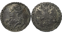 Красный монетный двор. Портрет московского типа влево. Аверс: над наплечником 4 точки и 3 ромбика, «Ц» в слове «IМПЕРАТРИЦА» с выколом. Реверс: хвост орла узкий, в крыльях по 9 контурных перьев, «Ц» с хвостиком, без точки после даты, точка перед «МОНЕТА». Гурт надпись. Серебро. Петрунин #80.1. Дьяков #14; 23 (аверс), #9 (реверс). Биткин #28; 29 (аверс), #22 (реверс). Уздеников #0644. ГМ #8.4; 9.1 (аверс), #7.12 (реверс). Уздеников #0644. 3 рубля по Ильину. 2 рубля 50 копеек по Петрову. Монета в слабе NGC старого образца, AU58.