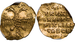 Старый Московский денежный двор. Золото, 0,82 г. Спасский (Русские государственные награды 1654 г. для войска Богдана Хмельницкого. Эрмитаж, 2013) стр.183 #1-8 (по типу). Биткин (медали) #68.В (R2). Монета в слабе CPRC, MS61.