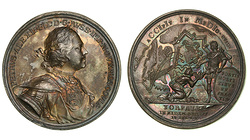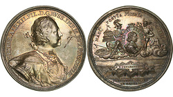 Санкт-Петербургский монетный двор. Из серии медалей с портретами русских князей и царей (первый выпуск с №№ 1-57 осуществлён в 1768-1772 годах). Автор лицевого штемпеля И. Б. Гасс (возле портрета, справа внизу «G ?»). На реверсе внизу в круглых скобках проставлен порядковый номер медали в серии – «50». Серебро, 25,63 г. Диаметр 39,0 мм. Дьяков #1653 (R3). Соколов #303. Смирнов #50. Сохранность отличная, красивая патина. Очень редка в серебряном исполнении.