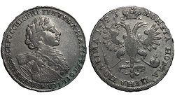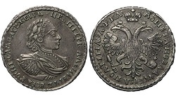 Редкая и интересная монета. Чеканка этих низкопробных монет велась по инициативе князя А.Д. Меншикова, сулила казне (и самому Меншикову) немалую прибыль, однако наносила вред экономике. Для того, чтобы придать добротный внешний вид монетам 42 (438) пробы в сплав «новой инвенции» стали добавлять мышьяк. Всего меншиковских гривенников успели выпустить на 40000 рублей, после чего, последовали указы об изъятии их из обращения.