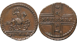Кадашевский монетный двор. «Парящий» всадник, поля шляпы широкие, загнуты кверху, на попоне коня три точки, «москва» малыми буквами, горизонтальная перекладина в букве «А» в слове «КОПЕЙКА» отсутствует. Стороны противопоставлены. Гурт узорный. Медь, 4,0 г. Дьяков #20 (ближайший аналог). Биткин #200 (ближайший аналог). Уздеников #2472. Brekke – не вошла в описание. ГМ #8.4 (ближайший аналог). От 60 копеек до 1 рубля по Петрову. Сохранность превосходная, красивая патина.