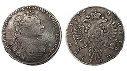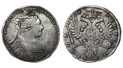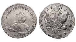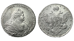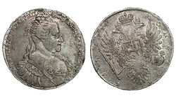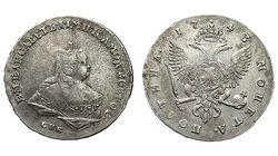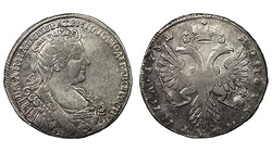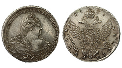 Редкая. Кадашевский монетный двор. Аверс: инициалы медальера "ОК", без арабесок на груди, без вышивки на рукаве. Реверс: "МАНЕТА". Гурт: "РУЕЛЬ". Биткин R, №204 стр.22, Уздеников №0556, Петров - 5 рублей.
