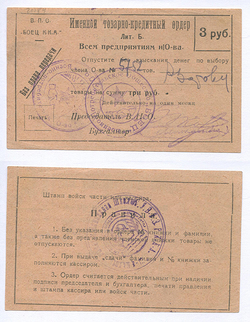 Тифлис. В. П. О. "Боец Р. К. А.". Именной товарно-кредитный ордер. 3 руб. Рябч.2 № 21184 Лит. А