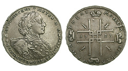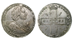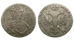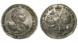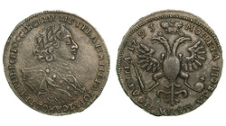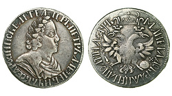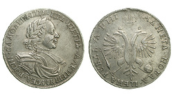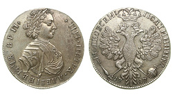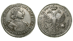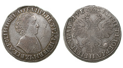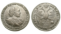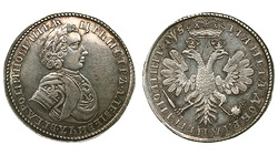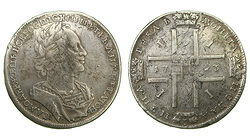 Красный монетный двор. Портрет образца 1704 года, работы Фёдора Алексеева. Без обозначения монетного двора. Центральная корона закрытая, высокая, на головах орла малые короны. Биткин R1, №801, стр. 97, Уздеников №0484. Дьяков (ЗС) #177 (R1). Петров - 6 рублей. Fritz Rudolf Kuenker #139. Оснабрюк, 13-14 марта 2008 года, лот 8306.