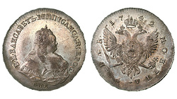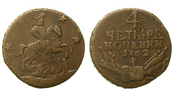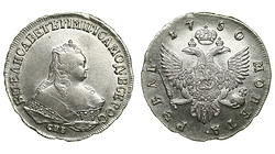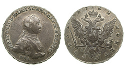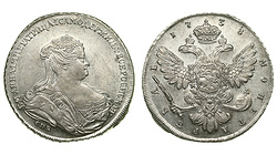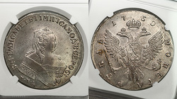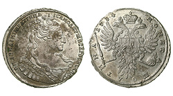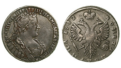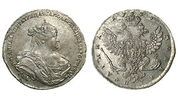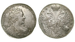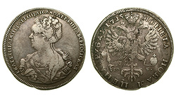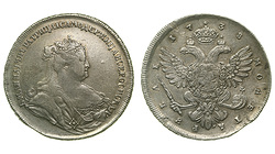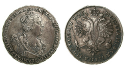 Редкая. Портрет уже. Биткин №12 R, стр.632, Уздеников №0116 (редкость - "черта"), Петров - 21 рубль, Ильин - 20 рублей. Слоение на поле монеты со стороны аверса. Механика на гурте со стороны реверса на 12 ч.