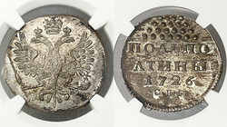 Редкая. Кадашевский монетный двор. Светло-серая патина. Аверс: особый "грубый" портрет, без инициалов, с арабесками на груди. Реверс: большая корона, "ПОЛТИIНА". Биткин № 583 R1, стр 72. Отсутствует у Узденикова. Петров - 10 рублей.