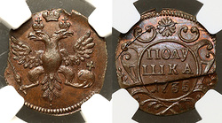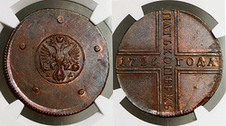Очень редкая. Кадашевский монетный двор. Портрет с большой головой. Биткин №515 R2, стр.64, Уздеников №0442 (редкость - "черта с точкой"). Петров - 25 рублей. С заключением центра исследований культурных ценностей.