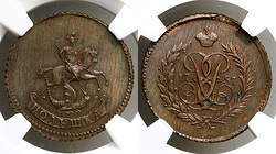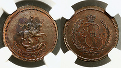 Россия. Полушка 1765 года. НОВОДЕЛ. MS62 BN.