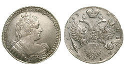 Редкая. Кадашевский монетный двор. Аверс: инициалы медальера "ОК", без арабесок на груди, без вышивки на рукаве. Реверс: "МАНЕТА". Гурт: "РУЕЛЬ". Биткин R, №204 стр.22, Уздеников №0556, Петров - 5 рублей.