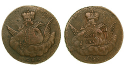 Редкая в такой сохранности. Четко выделен второй ряд перьев на крыльях орла. Перья в хвосте орла ровные. ЕМ меньше. Биткин №610 стр.661, Уздеников №2650.