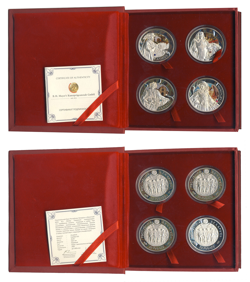 Серебро. 3,3635 oz. 0,925. 113,12 г. "Три мушкетера". KM# 242, 243, 244, 245. В оригинальных капсулах и коробке с сертификатом.