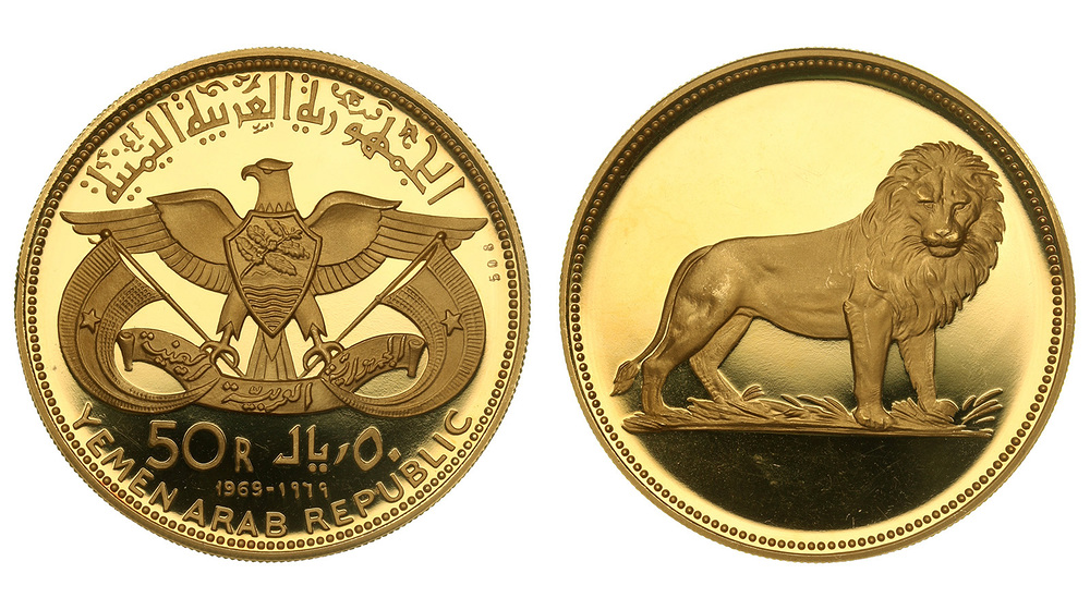 Редкая. Золото. 1,4178 oz. 0,900. 49,0 г. "Лев". Вариант штемпеля: у задней левой лапы три толстые травинки. КМ#11а. В оригинальной капсуле.