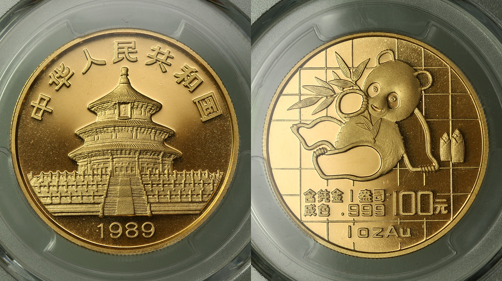 Золото. 1,0 oz. 0,999. 31,13 g. "Панда". Вариант с большой датой. КМ#229. В слабе PCGS MS68.