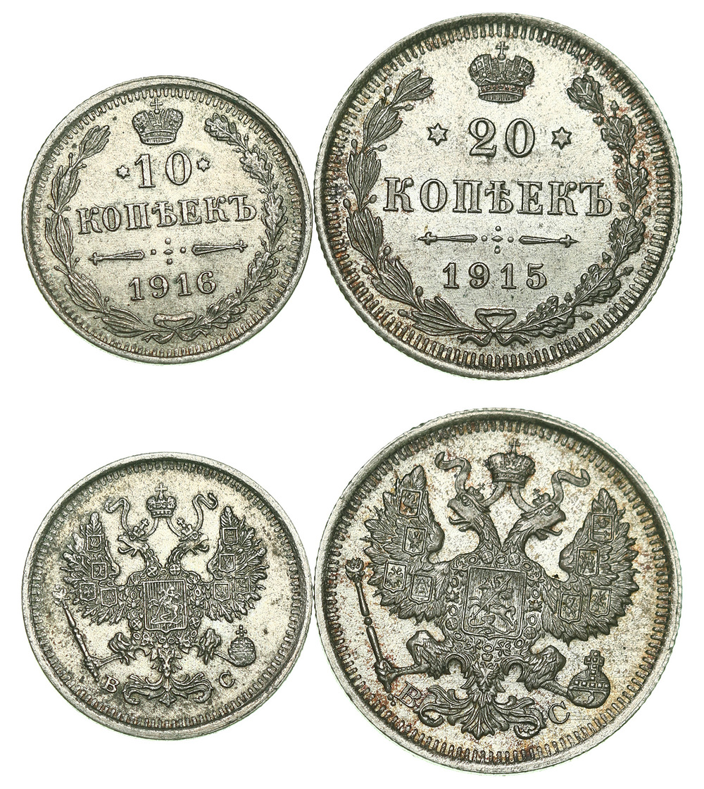 Серебро. 20 копеек 1915 года; 10 копеек 1916 года.