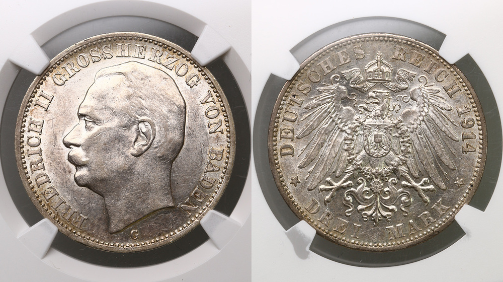 Германия. Баден. Фридрих II. 3 марки 1914 года. В слабе NGC AU58.