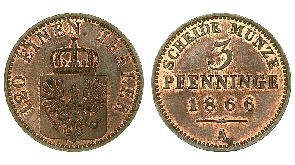 Германия. Пруссия. Вильгельм I. 3 пфеннига 1866 года.