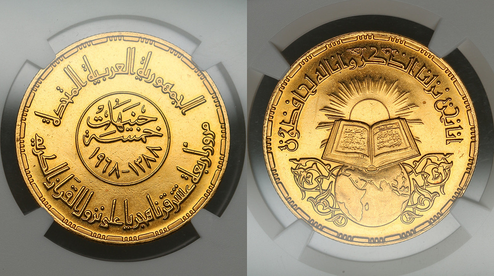 Довольно редкая. Золото. 0,7314 oz. 0,875. 26,0 г. "1400 лет Корану." КМ#416. Единственная монета с изображением Корана. Монета выпущена в период существования Объединённой Арабской Республики.