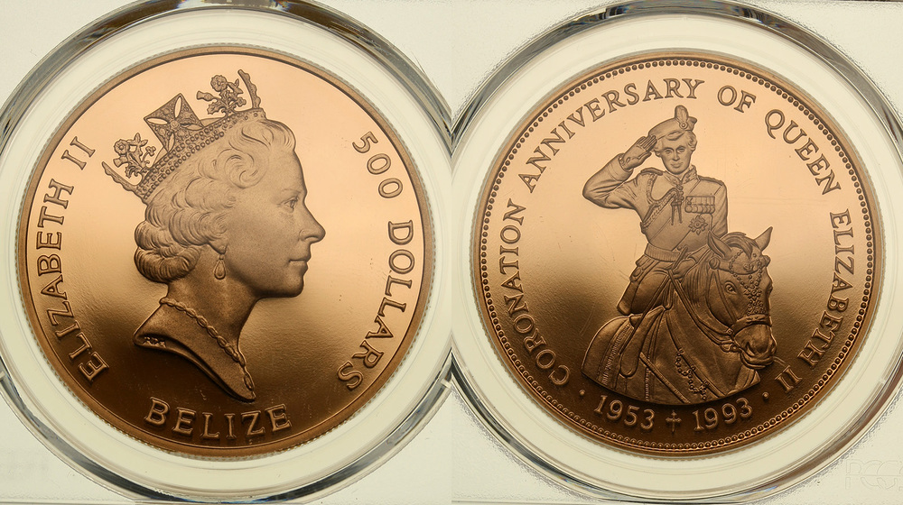 Белиз. Елизавета II. 500 долларов 1993 года. В слабе PCGS PR70DCAM. Proof.