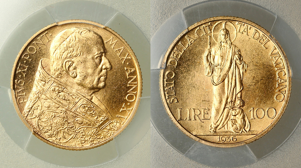 Ватикан. Пий XI. 100 лир 1936 года. В слабе PCGS MS64.