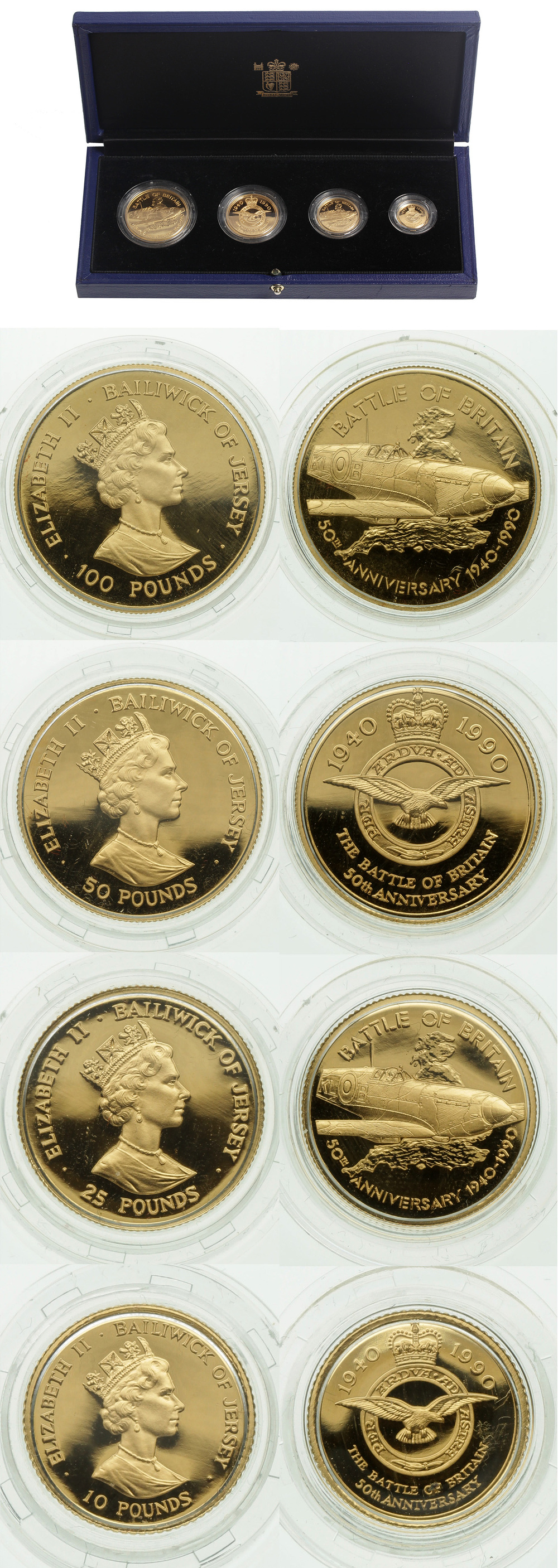 Золото. 1,8551 oz. 0,999. 57,76 г. Номиналы: 10, 25, 50 и 100 фунтов. "50-летие битвы за Британию". Тираж 500 шт. KM#PS10. В оригинальных капсулах и упаковке с сертификатом.