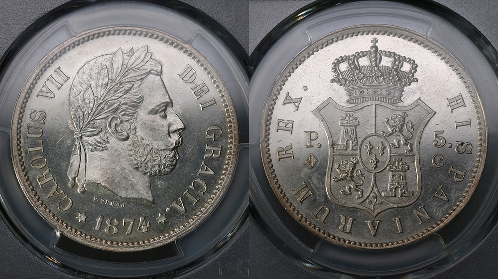 Испания. Карл VII. 5 песет 1874 года. SP63.