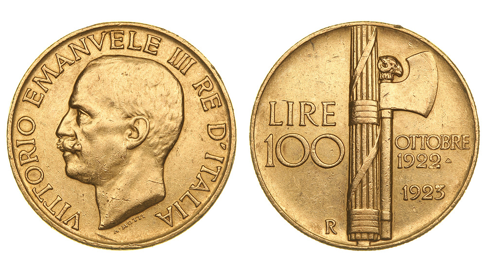 Золото. 0,9334 oz. 0,900. 32,26 г. "1-я годовщина фашистского правления". КМ#65. Следы хранения, микроцарапины.
