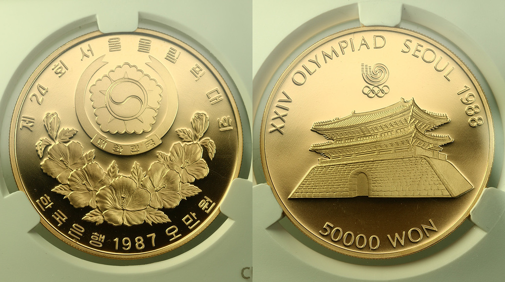 Золото. 0.9998 oz. 0,925. 33,62 г. "Олимпийские игры в Сеуле. Великие южные ворота". КМ#65. CPRC PF70 Ultra Cameo.