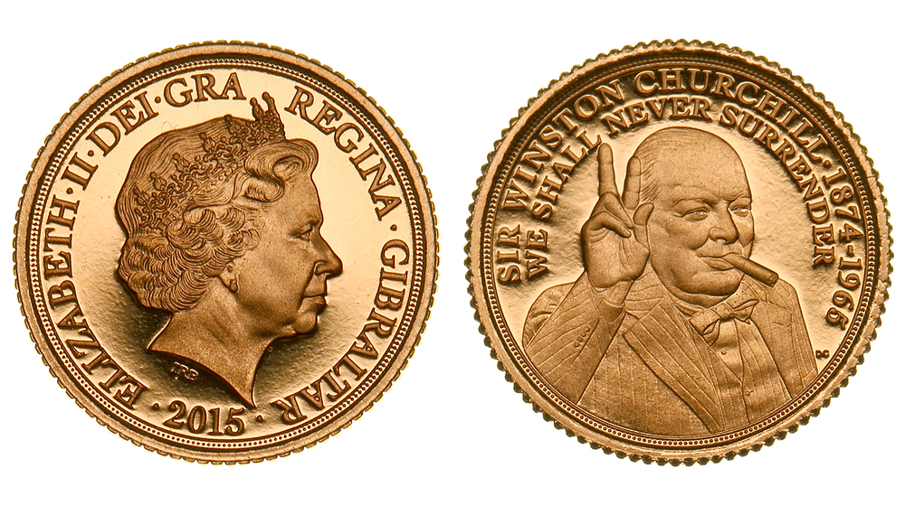 Золото. 0,0587 oz. 0,917. 1,99 г. "50 лет со дня смерти Уинстона Черчилля".