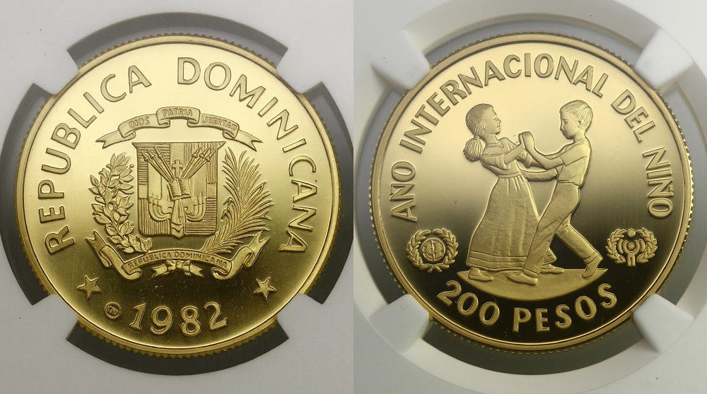 Доминиканская Республика. 200 песо 1982 года. Proof. В слабе NGC PF69 Ultra Cameo.