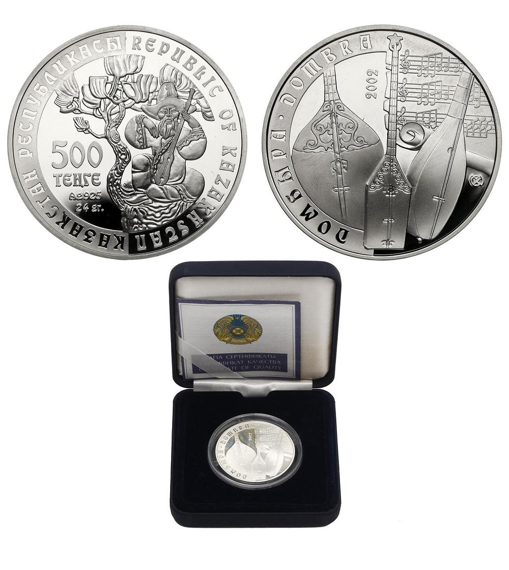 Серебро. 0,7138 oz. 0,925. 24,0 г. "Серия Прикладное искусство - Домбра (музыкальный инструмент)". Тираж 3000 шт. В оригинальной коробке и капсуле. С сертификатом.