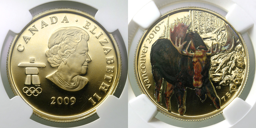 Золото. 0,2249 oz. 0,583. 12,0 г. "Олимпийские игры в Ванкувере 2010. Лось". Цветная. KM#908. В слабе PF69 ULTRA CAMEO.