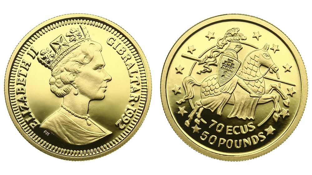 Гибралтар. Елизавета II. 70 экю - 50 фунтов 1992 года. Proof.