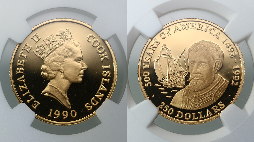 Кука о-ва. Елизавета II. 250 долларов 1990 года. Proof. PF68 Ultra Cameo.