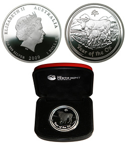 Серебро. 1,0 oz. 0,999. 31,13 г. "Год быка". В оригинальной капсуле и коробке с сертификатом.