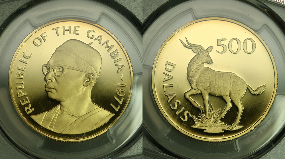 Гамбия. 500 даласи 1977 года. Proof. В слабе PCGS PR69DCAM.