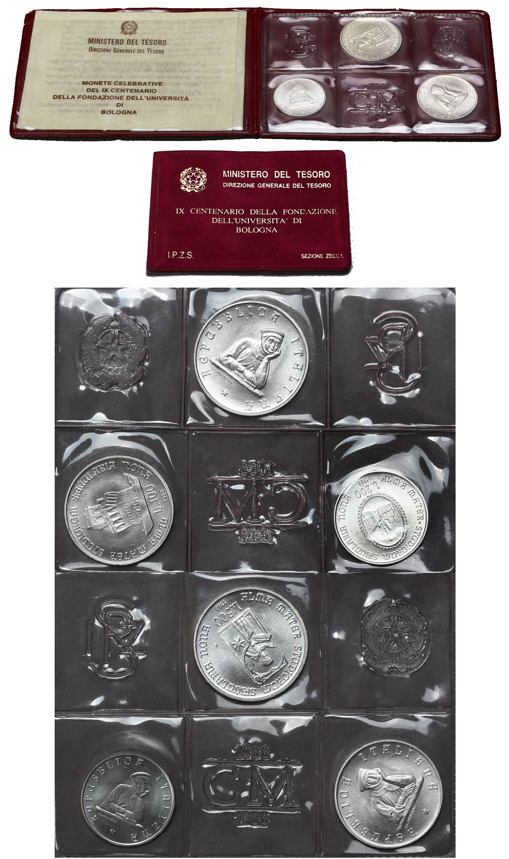 Серебро. 0,6443 oz. 0,835. 24,0 г. 100, 200 и 500 лир. "900 лет Университету в Болонье". В оригинальной упаковке с сертификатом. Незначительное повреждение пластика внутри упаковки.