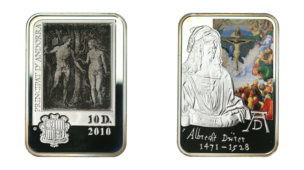 Серебро. 0,841 oz. 0,925. 28,28 г. "Альбрехт Дюрер". Цветная эмаль. КМ#283. В оригинальной капсуле. С сертификатом.