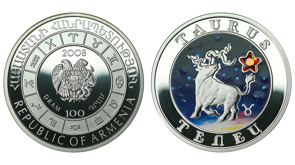 Серебро. 0,8410 oz. 0,925, 28,28 г. "Телец". KM#141. С цветной эмалью. Вставка- Циркон. В оригинальной капсуле.