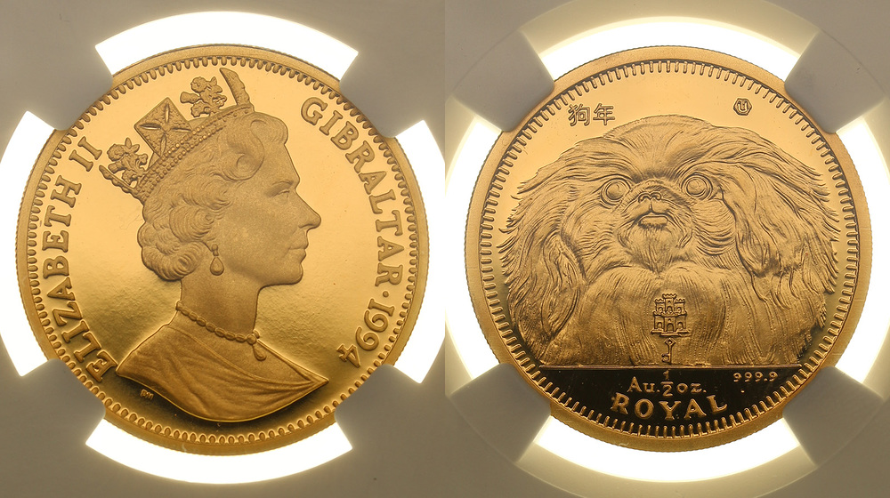 Только одна монета имеет грейд выше, и только одна MS68 (в компании NGC на декабрь 2025) Довольно редкая. Золото. 0,4999 oz. 0,999. 15,55 г. "Собака Пекинес". КМ#251.