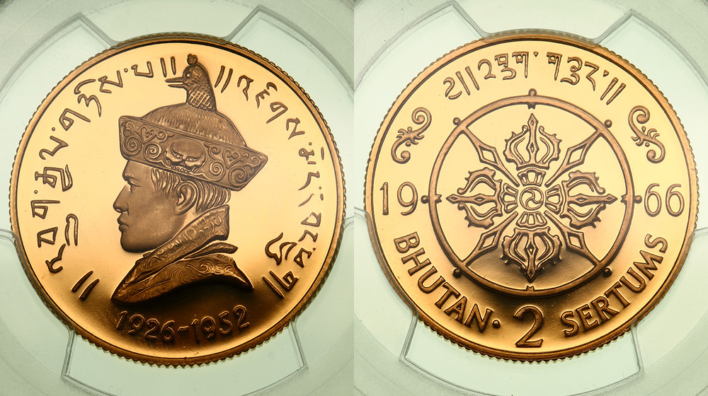 Бутан. 2 сертума 1966 года. В слабе PCGS PR68DCAM. Proof.