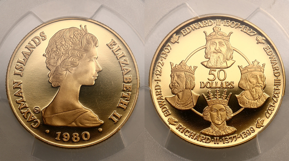 Каймановы о-ва. Елизавета II. 50 долларов 1980 года. Proof. В слабе PCGS PR67DCAM.
