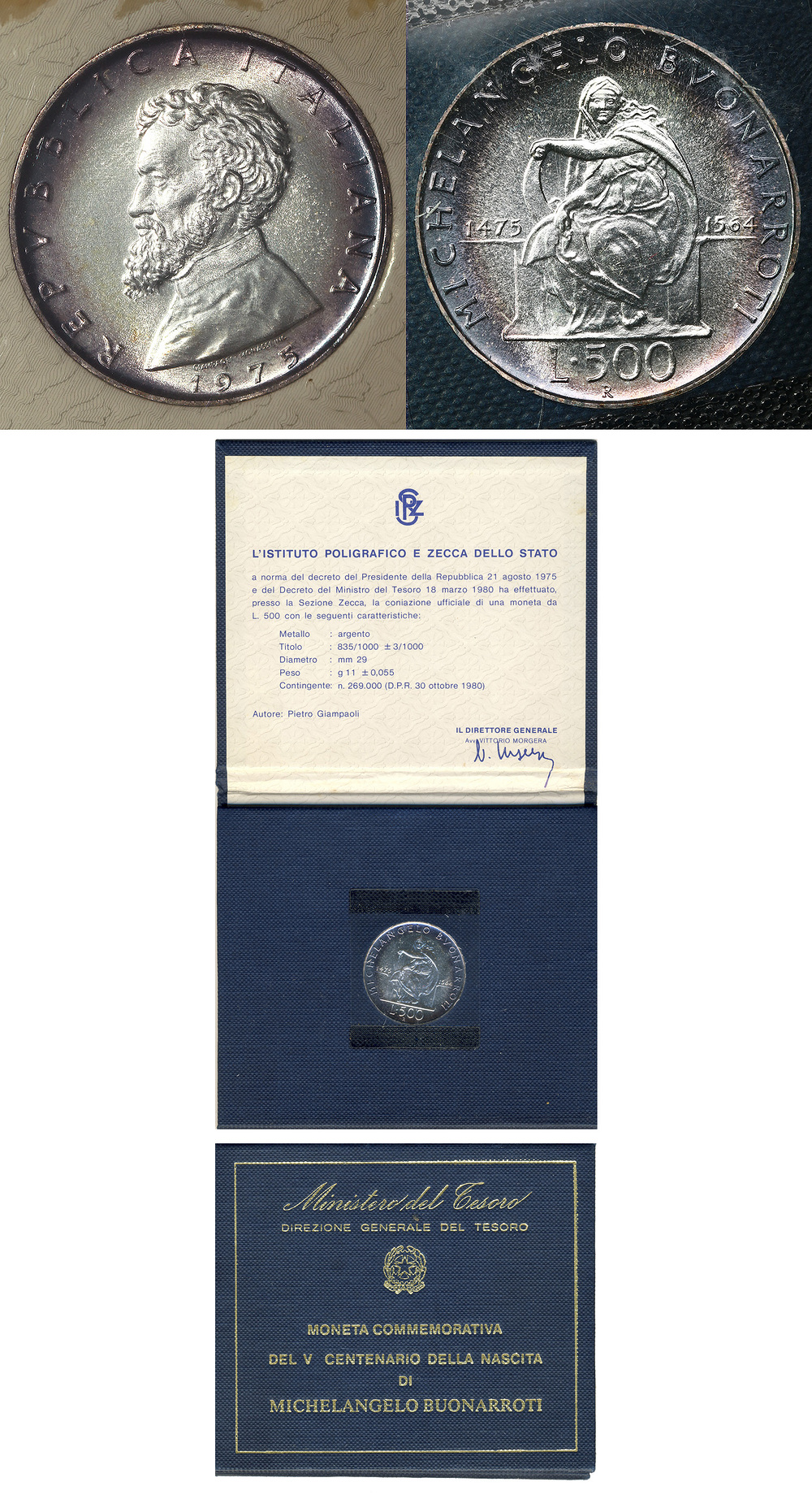 Серебро. 0,2953 oz. 0,835. 11,0 г. "500-летие Микеланджело". КМ#104. Оригинальная подарочная упаковка