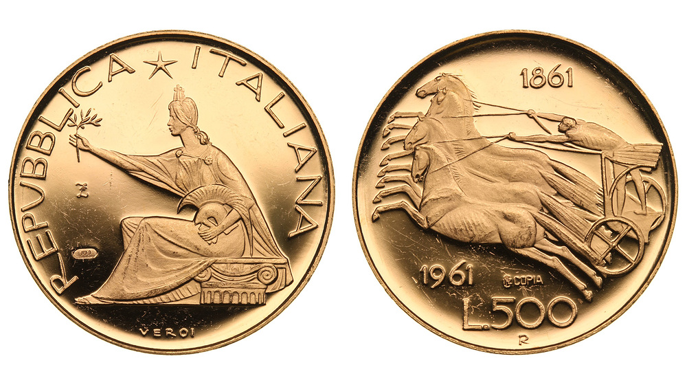Италия. 500 лир 1961 года (выпуск в золоте серебряной монеты 2006 года). Proof.