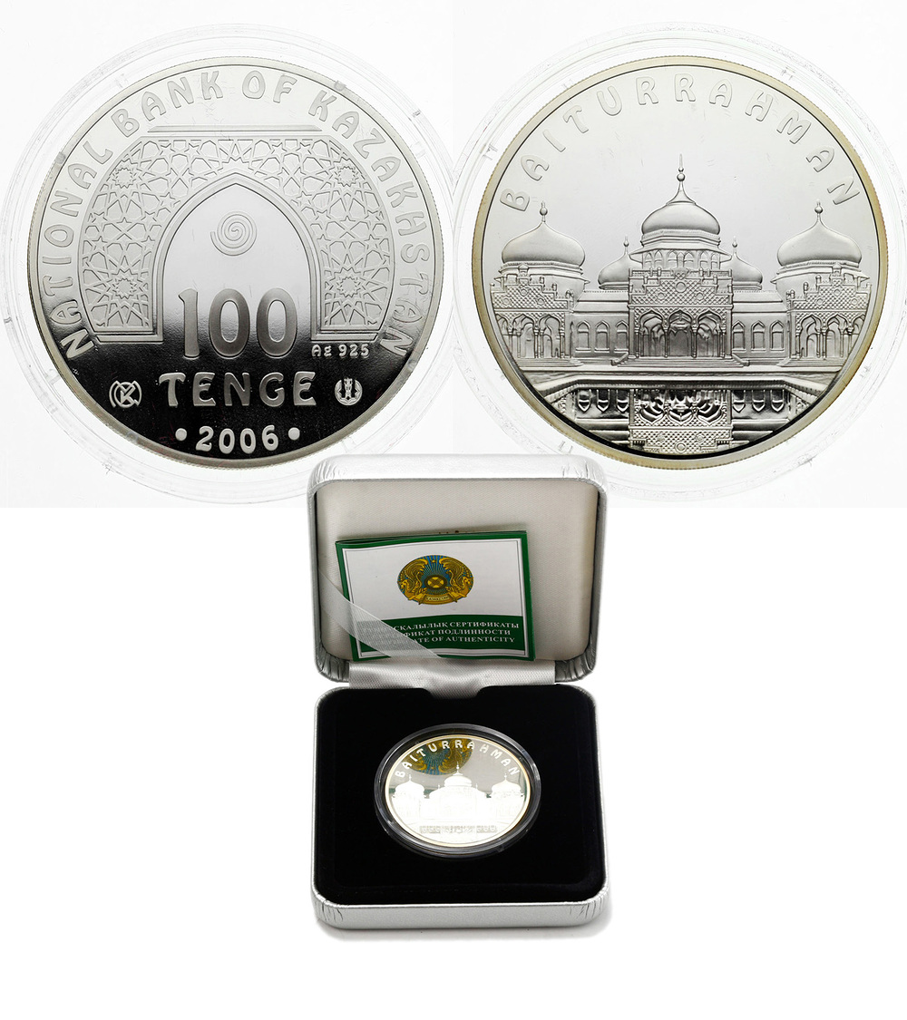 Серебро. 0,925 oz. 0,925. 31,1 г. "Знаменитые мечети мира - Мечеть Байтуррахман Рая". KM#95. В оригинальной коробке и капсуле. Следы хранения.