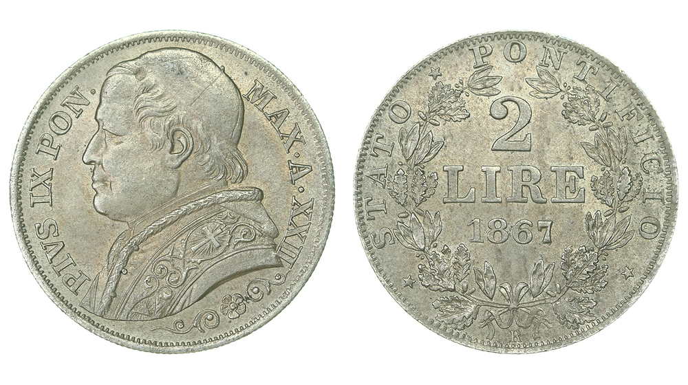 Ватикан. Пий IX. 2 лиры 1867 года.