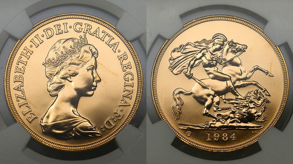 Англия. Елизавета II. 5 фунтов 1984 года. MS67.