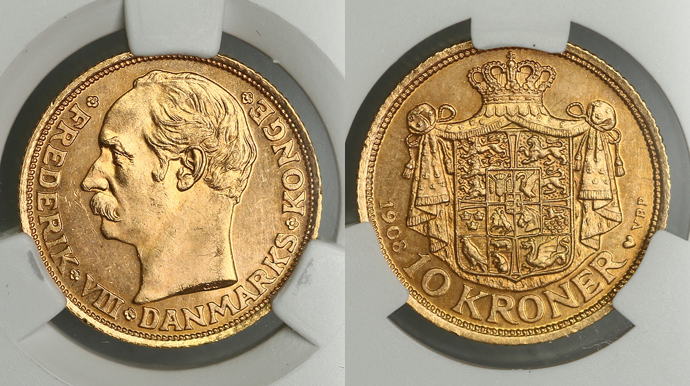 Дания. Фредерик VIII. 10 крон 1908 года. В слабе CPRC MS63.